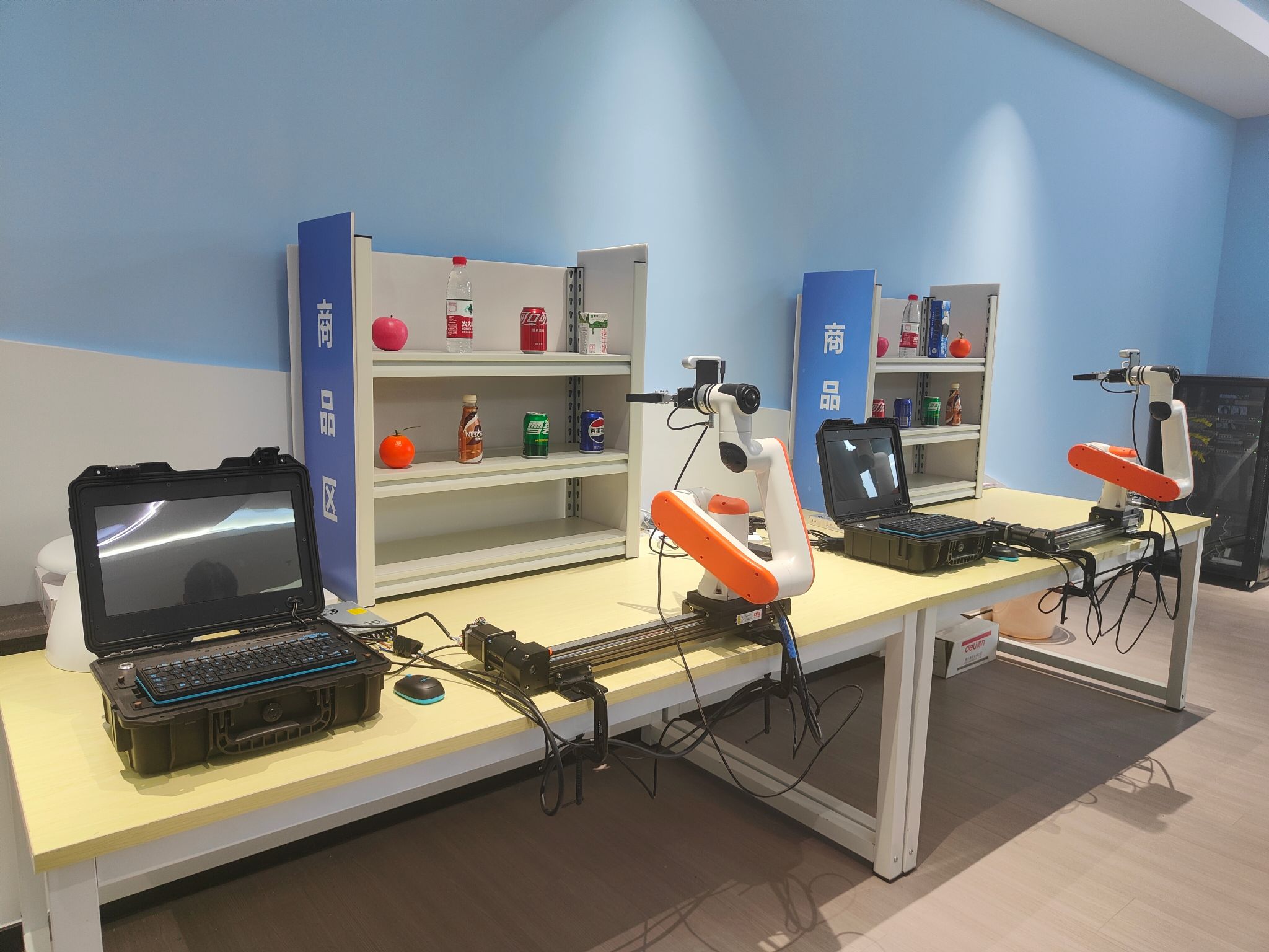 为深化场景理解,实验室配备了基于大模型的轮式人形机器人、穿戴式数据采集套件、智慧物流场景抓取机器人及AI大模型智慧零售实训平台等前沿设备,将大模型技术与具身智能、智慧物流、智能零售等行业应用紧密结合,培养员工大模型部署、调优、智能体构建及场景化应用开发能力,为专业课程实验教学、综合实践、学科竞赛及师生开展前沿科研与跨学科创新提供全方位支持。