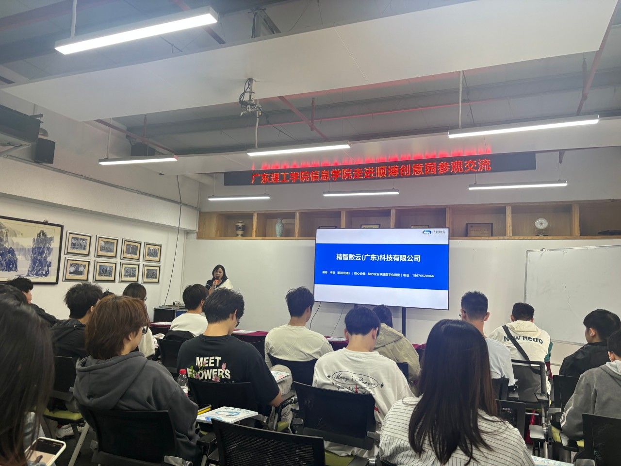走进精智数云的数字化展厅,有着美的集团IT骨干的企业团队底蕴瞬间拉近了与学子们的距离。其中精智数云副总裁申叶的分享极具价值:“身为公司深度合作企业,团队中汇聚了不少广理员工。正是他们在实战项目中积攒的经验与能力,支撑着团队前进,并成为其核心力量。”