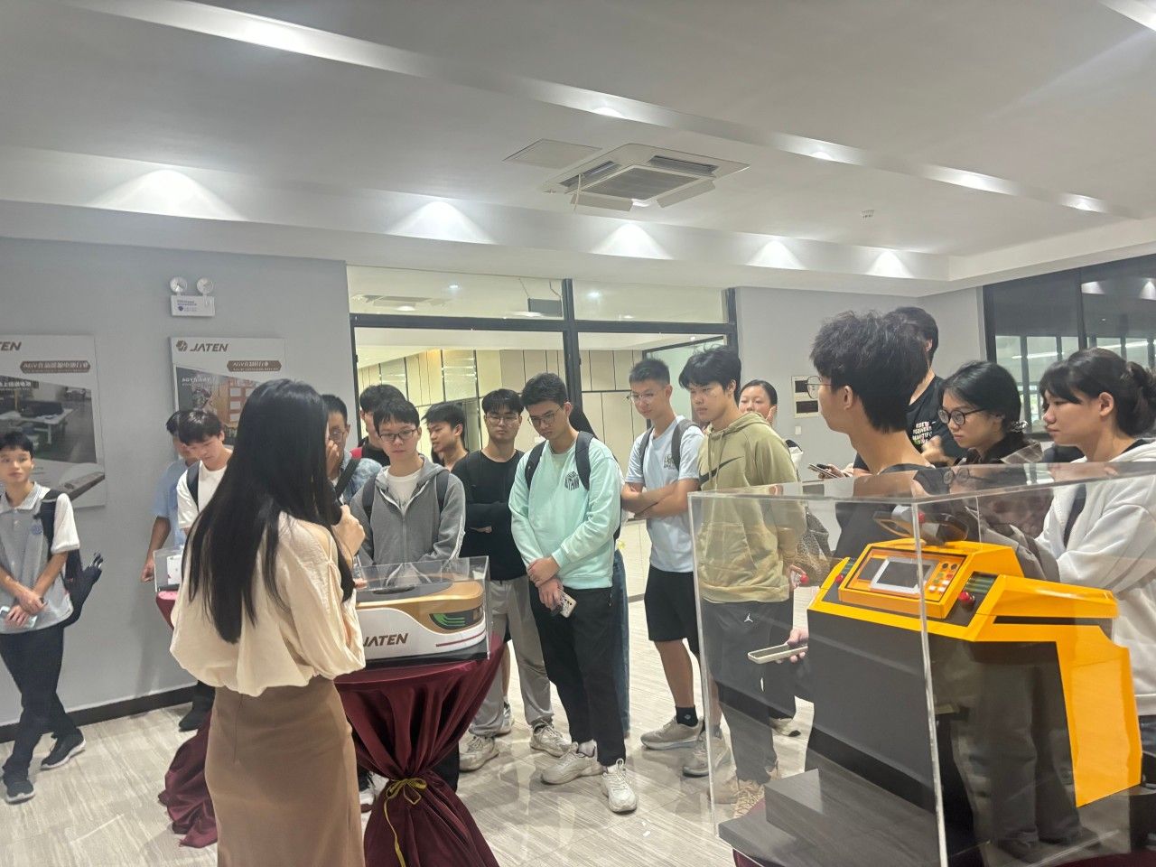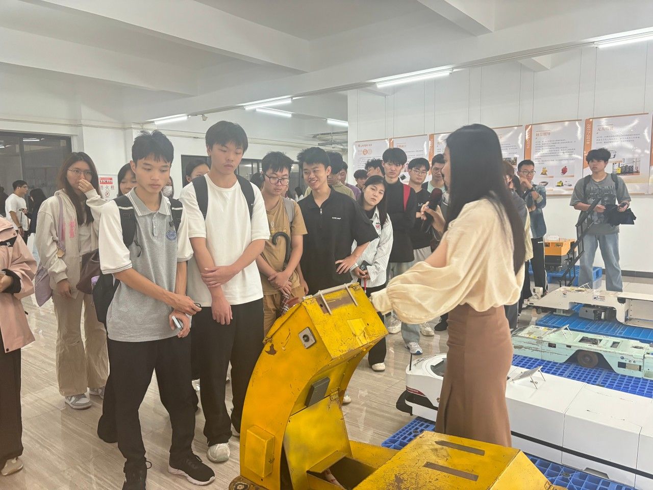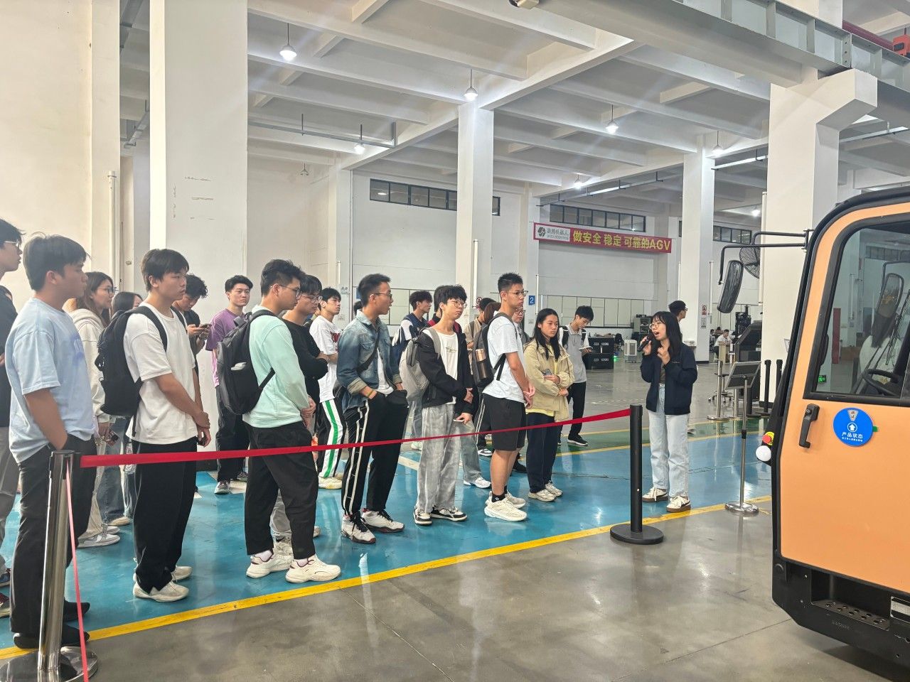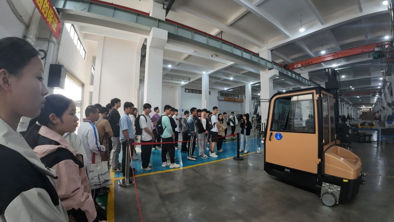 “企业最需要能打通理论与实践的实干型人才,实践就是衔接校园与职场的关键桥梁。”,讲师的话让在场学子深受启发。随后的展厅参观中,从负载可达220吨的重载机器人,到荣获“创客中国“一等奖的”大黄蜂"AGV,历年迭代的数十多种智能搬运设备,静静诉说着技术突破的轨迹。车间里,企业导师带领大家近距离观察AGV生产流程,从激光导航技术到“嘉腾大脑”调度系统的实战演示,让课本上的“智能物流”变得可感可触。
