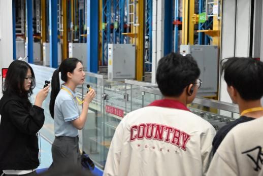 师生们来到仓库,章瑜玥向大家介绍了无人化仓储物流、货物自动识别扫码入库、机器自动拣货等智能化技术应用。