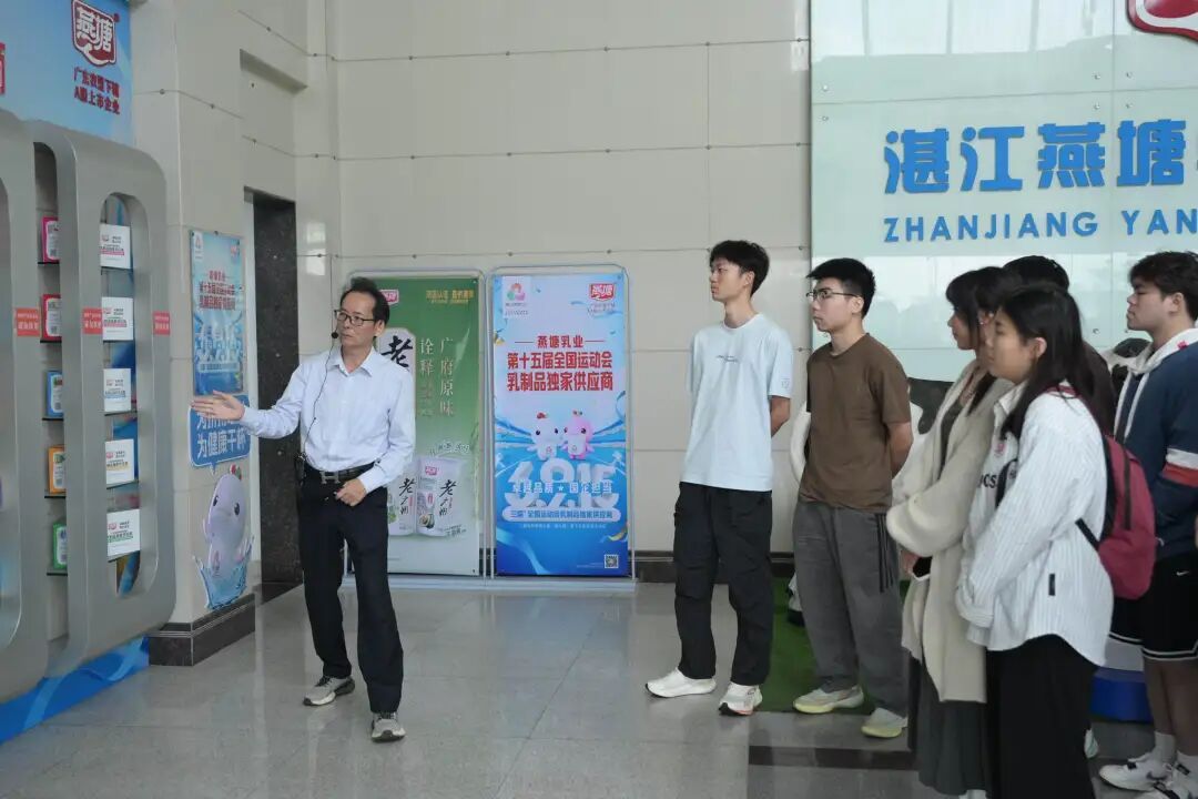 从数字世界转向实体智造,活动的第二站,同学们来到了知名的乳制品企业——湛江燕塘乳业有限公司。跟随着讲解员的脚步,同学们走进了燕塘乳业的“透明化”智能生产车间。透过明亮的观光走廊,从原料验收、无菌灌装到自动化包装,整个高度智能化的生产线一览无余,让大家对“中国智造”在现代食品工业中的高效与精准有了震撼性的认知。
