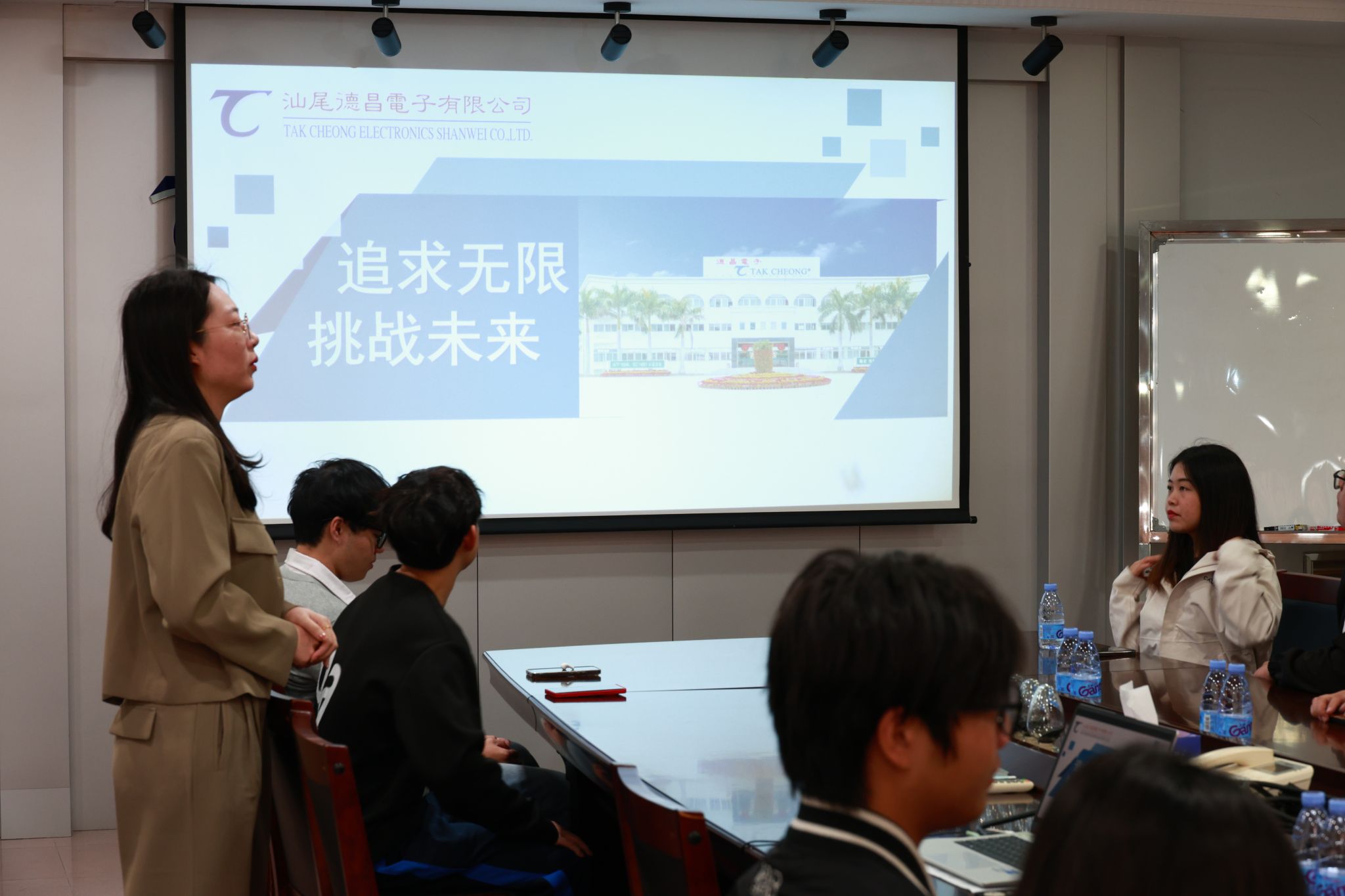 师生首先观看了企业介绍视频,视频系统呈现了德昌电子从传统电子元件制造商向“创新型元件解决方案提供商”的转型历程。在新型电容、高频电感、微型连接器等领域的技术积淀与专利布局,也让同学们对 “电子元件产业生态” 有了全新认知。