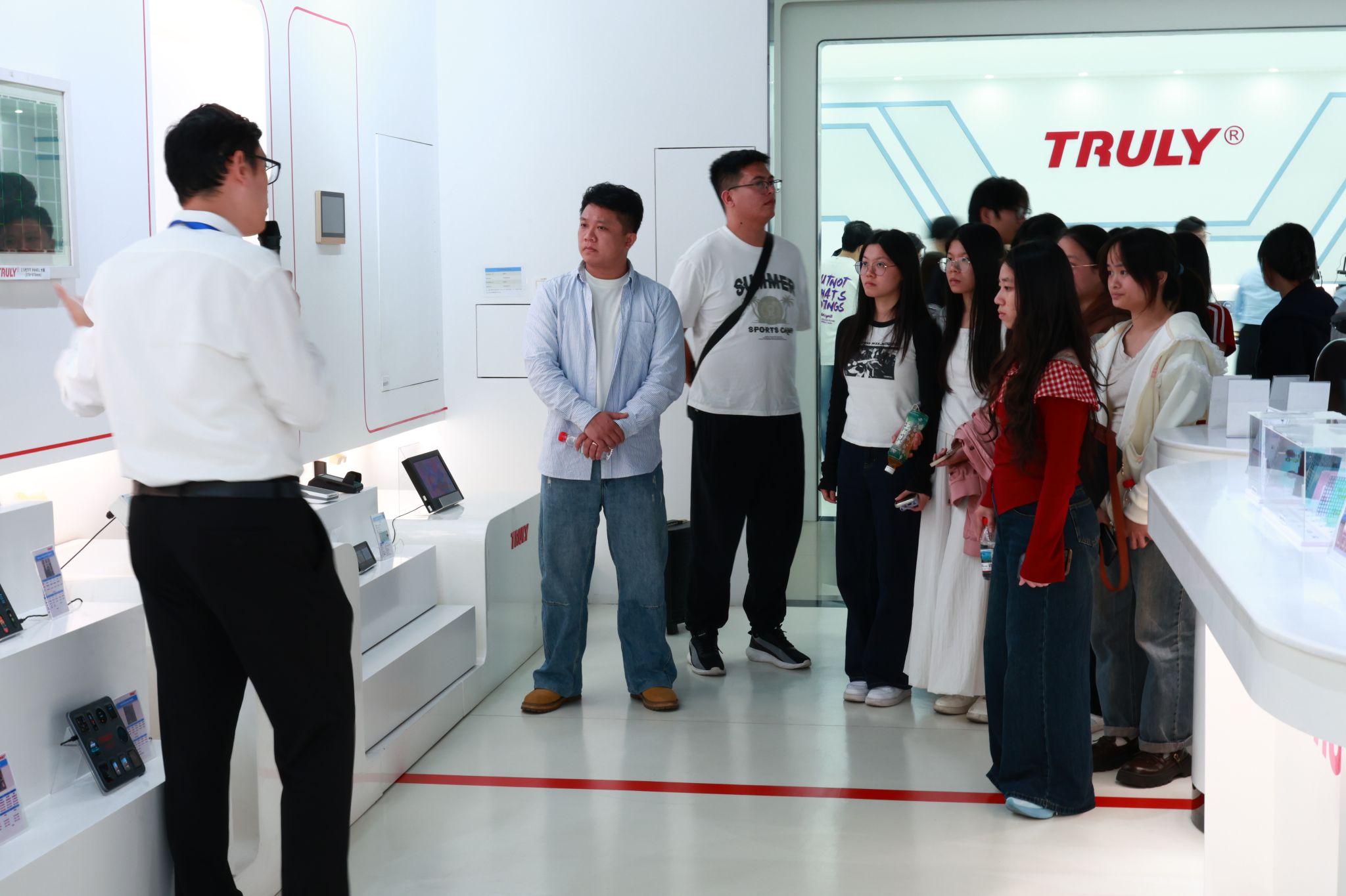 交流会结束后,信利半导体有限公司王辉经理带领师生一行人走进信利产品展厅。展品涵盖LCD与OLED显示屏、传感器芯片、车规级功率芯片等,尤其在柔性显示、高精度传感等领域技术优势显著,产品广泛应用于手机、汽车、医疗和工业等多个领域。车载产品还深度参与无人驾驶技术体系,引发了同学们的浓厚兴趣。