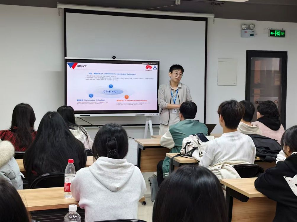 从传统通信(2G-5G)到互联网高速发展催生的云计算、大数据、人工智能浪潮,企业高级讲师张志雄深度剖析ICT行业演进逻辑,让师生们清晰把握“算力供给、数据难题破解、AI开端”的行业脉络。不仅如此,张老师还为大家现场展示华为数通系列、云计算系列设备并带领我们深入了解了处理器内部与外部的构成和作用。