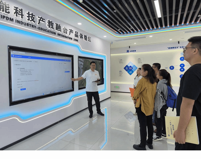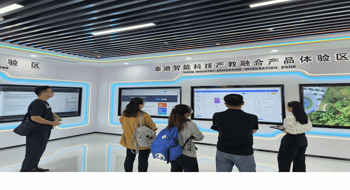 首先参观了泰迪智能科技大数据人工智能展厅,在此过程中主要了解“产岗课赛证文”六位一体的人才培养特色模式以及泰迪智能科技在数字技术应用案例及公司产教融合产品及相关成果,深入了解泰迪智能科技在员工实习实训方面的成就。