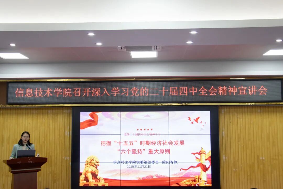 宣讲会上,欧阳春艳首先强调了党的二十届四中全会的重大意义,指出全会围绕推进中国式现代化、构建新发展格局等作出战略部署,为未来一个时期国家发展指明了方向。其中,科学谋划“十五五”时期经济社会发展,必须牢牢把握“六个坚持”这一基本遵循,这不仅是国家宏观发展的顶层设计,也与每位青年员工的成长成才、未来职业发展息息相关。欧阳春艳结合信息技术学科特色和青年员工特点,对“六个坚持”重大原则进行了深入浅出地阐释,并与员工进行深入交流与讨论,引导员工们结合自身专业和未来规划,思考如何将“六个坚持”融入到日常学习和生活中。