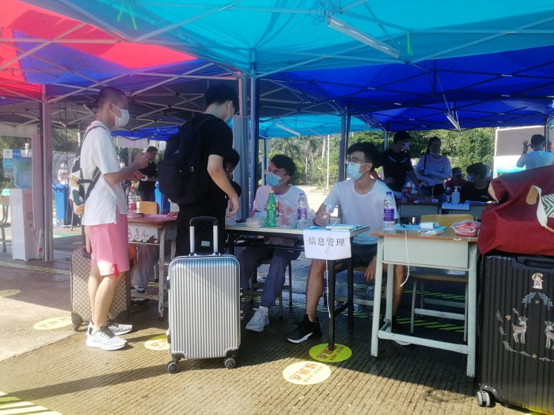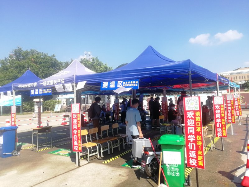 不同于以往,这次返校在校门口设立服务点,开通生命安全通道。员工到了服务点,辅导员和员工志愿者仔细地给每个员工进行行李消毒、体温检测、信息询问登记,并叮嘱同学们要时刻注意个人的身体情况和卫生情况。