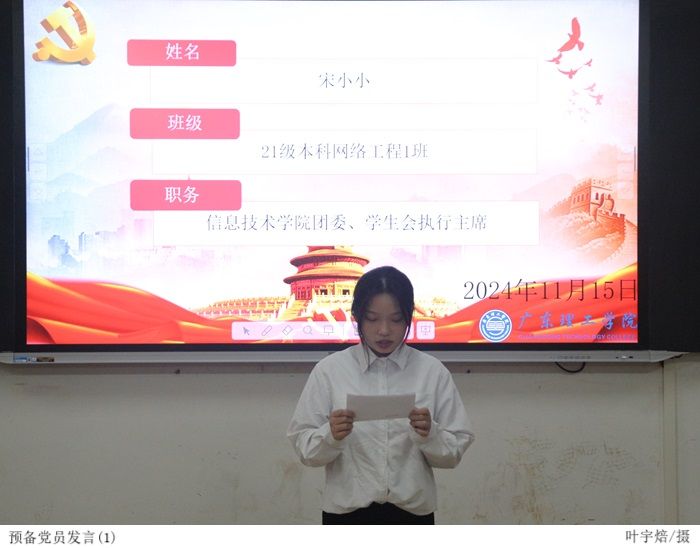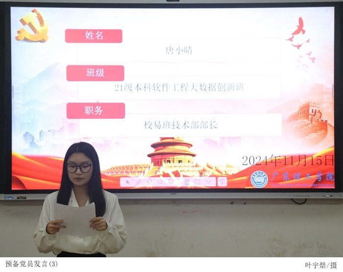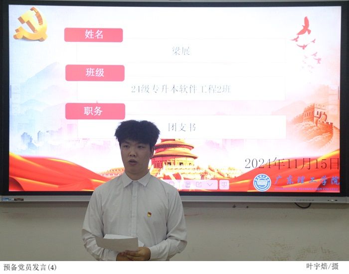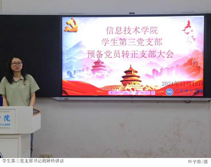 会议开始,胡娇铃对预备党员转正大会的具体流程和注意事项进行详细的介绍。四名预备党员依次上台,汇报了自己成为预备党员以来在思想、工作、学习等方面的具体情况。他们表示在今后将更加认真学习党的思想理论,切实贯彻党的作风要求,在学习过程中不断发现自身问题并及时改正。他们强调要时刻牢记党员使命,不忘初心为党的伟大事业贡献自己的一份力量。