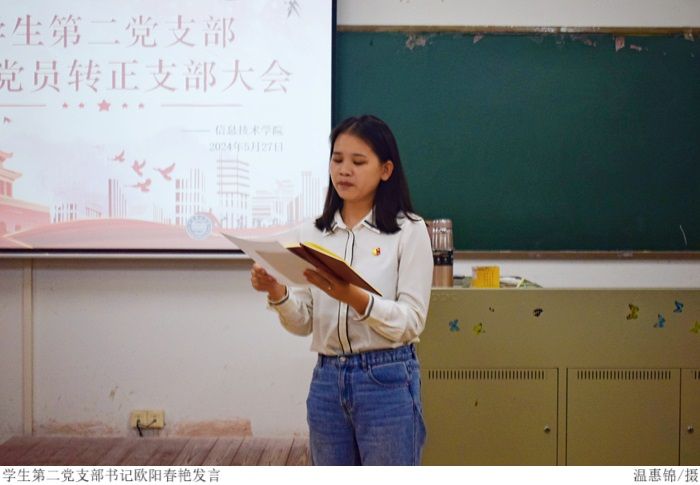 会上,欧阳春艳详细介绍了预备党员转正大会的具体流程。各预备党员依次向组织汇报了自己在预备期内的思想、工作、生活方面所取得的进步,同时指出自身存在的缺点和不足,并表示在今后将以党员的标准更加严格要求自己,不断努力,表明下个阶段改进的态度和决心。