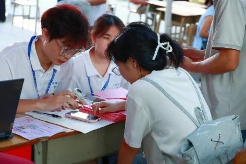 助理班主任和志愿者们穿梭于校园各处,为有需要的同学指引、递水、撑伞,帮忙搬运相行李,以暖心行动,消同学们的烦忧,让新生及家长们感受到满满的诚意与关怀。