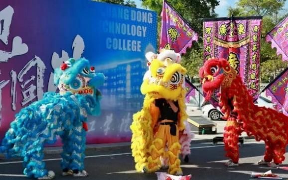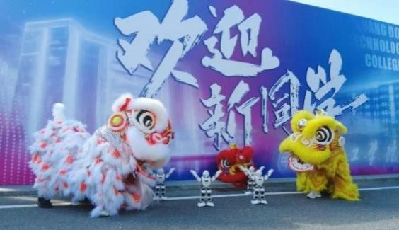 下午9:00,科技广场迎新展板处有机械人和醒狮共舞,科技与传统碰撞出别样火花;