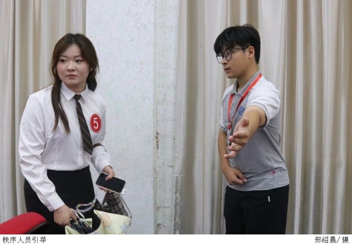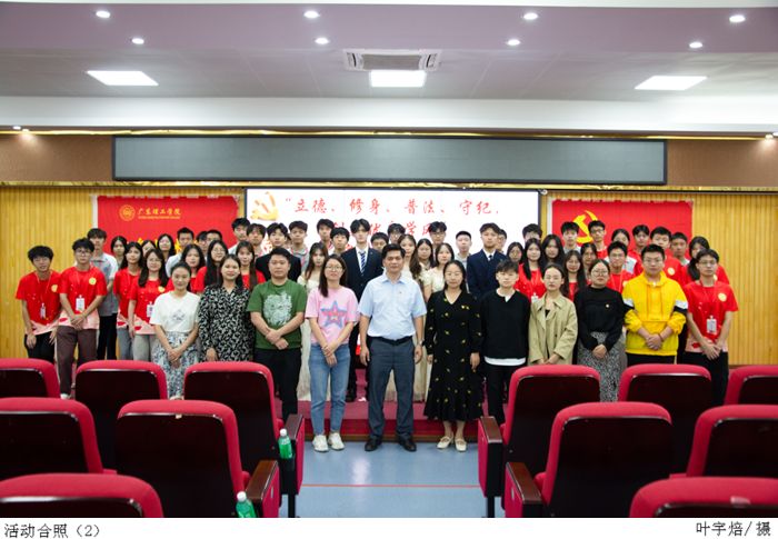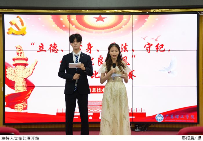 赛前,工作人员提前布置会场并检查设备的状况,随后参赛选手在礼仪的引导下入场准备。活动正式开始,全体人员肃立面向国旗,齐声奏唱国歌。主持人宣布此次比赛的规则和评分细则后,选手们依次上台演讲,他们站在不同的角度阐述自己对立德、修身、普法、守纪的深刻见解,并以严谨的语言论述“立德、修身、普法、守纪”对营造良好学风的重要意义。参赛选手们用他们精彩的演讲呼吁要坚持营造美好的校园风气,引起了台下观众的共鸣。