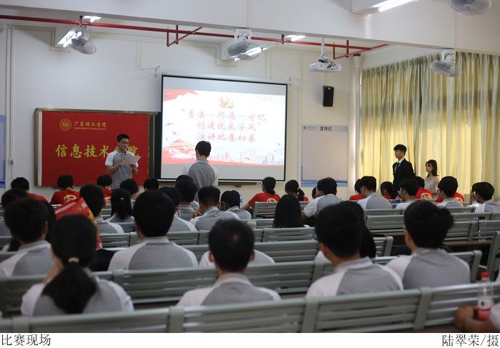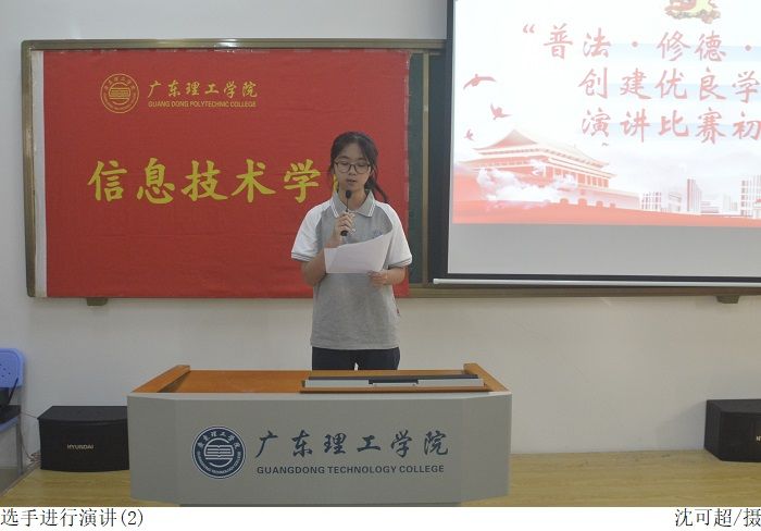 比赛伊始,全体人员起立面向国旗,奏唱国歌。主持人介绍比赛流程、比赛规则后,宣布比赛正式开始。参赛选手依次上台演讲,演讲围绕“普法、修德、守纪,创建优良学风”的主题开展,内容紧贴政治时事。比赛过程中,评委们根据各位选手的表现给出了相应的分数。