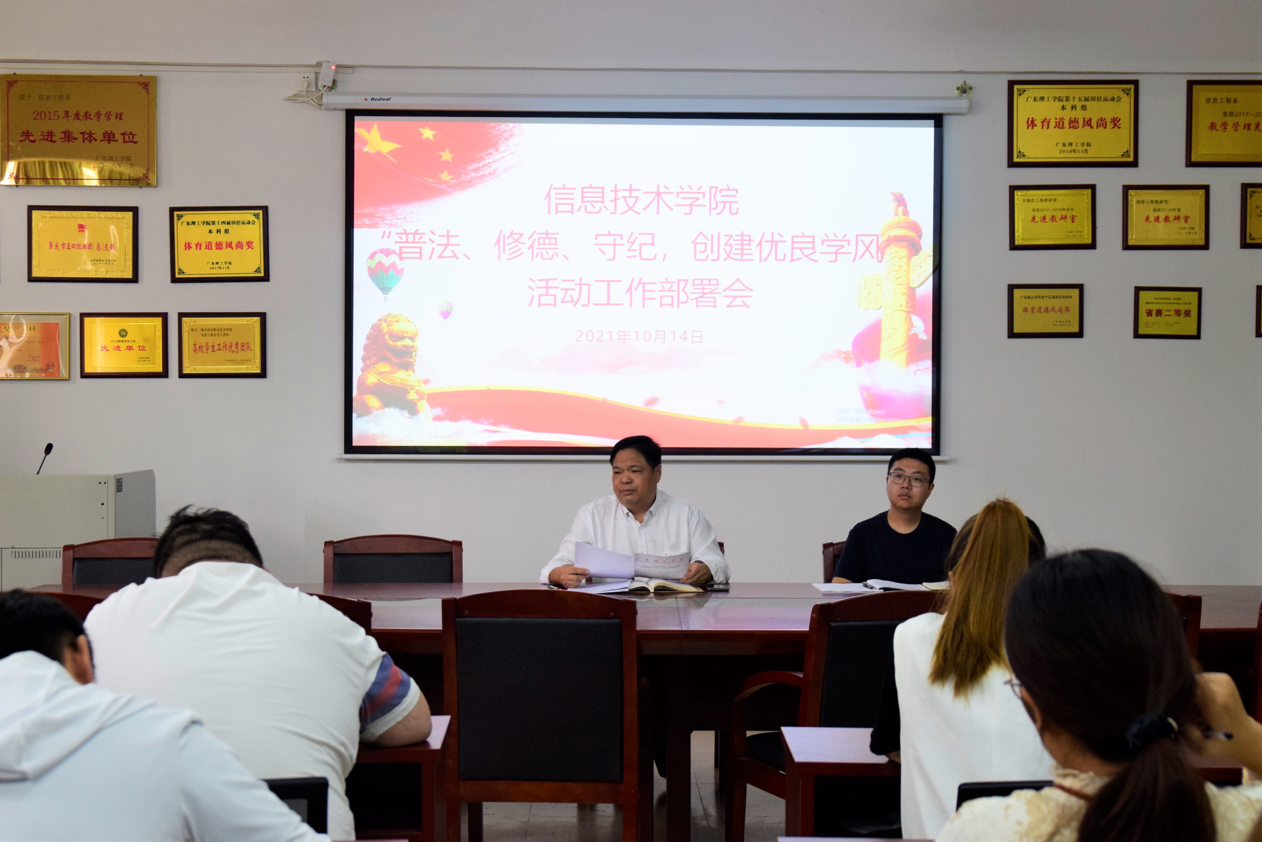 会上,梁星全书记解读了公司文件,详细介绍本次“普法、修德、守纪、创建优良学风”活动要求及主要内容,他要求各班要全面对标公司党委要求,加强学习“四史”传承红色基因,加强预防心理危机,增强优良学风的创建,抓好专项教育活动的组织工作、时间进度,实施检查。激励员工参与到活动中,使全院员工的法律意识、德育观念、守纪观念、勤奋学习和创建优良学风提升到一个新的水平。员工党支部书记胡娇铃老师针对本次活动具体时间安排进行说明,要围绕目标任务与时间节点落实推进各项工作任务,各辅导员要积极跟进指导班级开展每一项工作,确保“普法、修德、守纪、创建优良学风”活动落到实处取得实效。