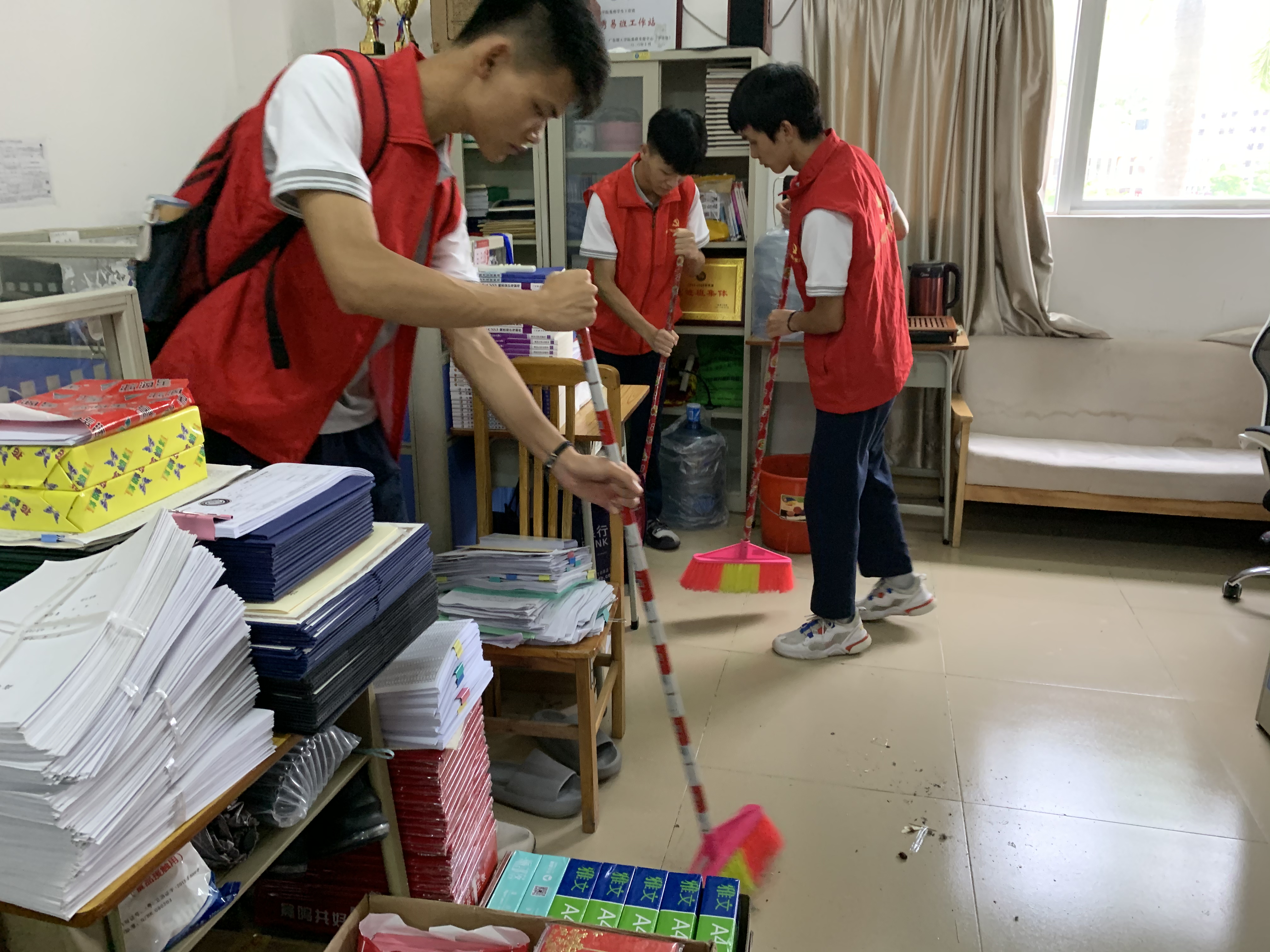 在此次活动中,志愿者们准时到达指定地点集合,穿上红色马甲,前往各自负责的清扫区域,对教学楼楼道、楼梯、办公室等区域进行清洁,清理校道及绿化带内的树叶、烟头、塑料袋等垃圾杂物,检查校园及心理辅导站内外,更换存在过时、残、旧、破损等现象的各类宣传广告和宣传栏,并按规定引导同学摆放自行车,劝导车辆不乱停放,同时加强校园禁烟宣传教育,杜绝校园吸烟现象,呼吁同学们共同参与到清洁校园、美化环境的队伍当中,共同为文明校园的创建出一份力。