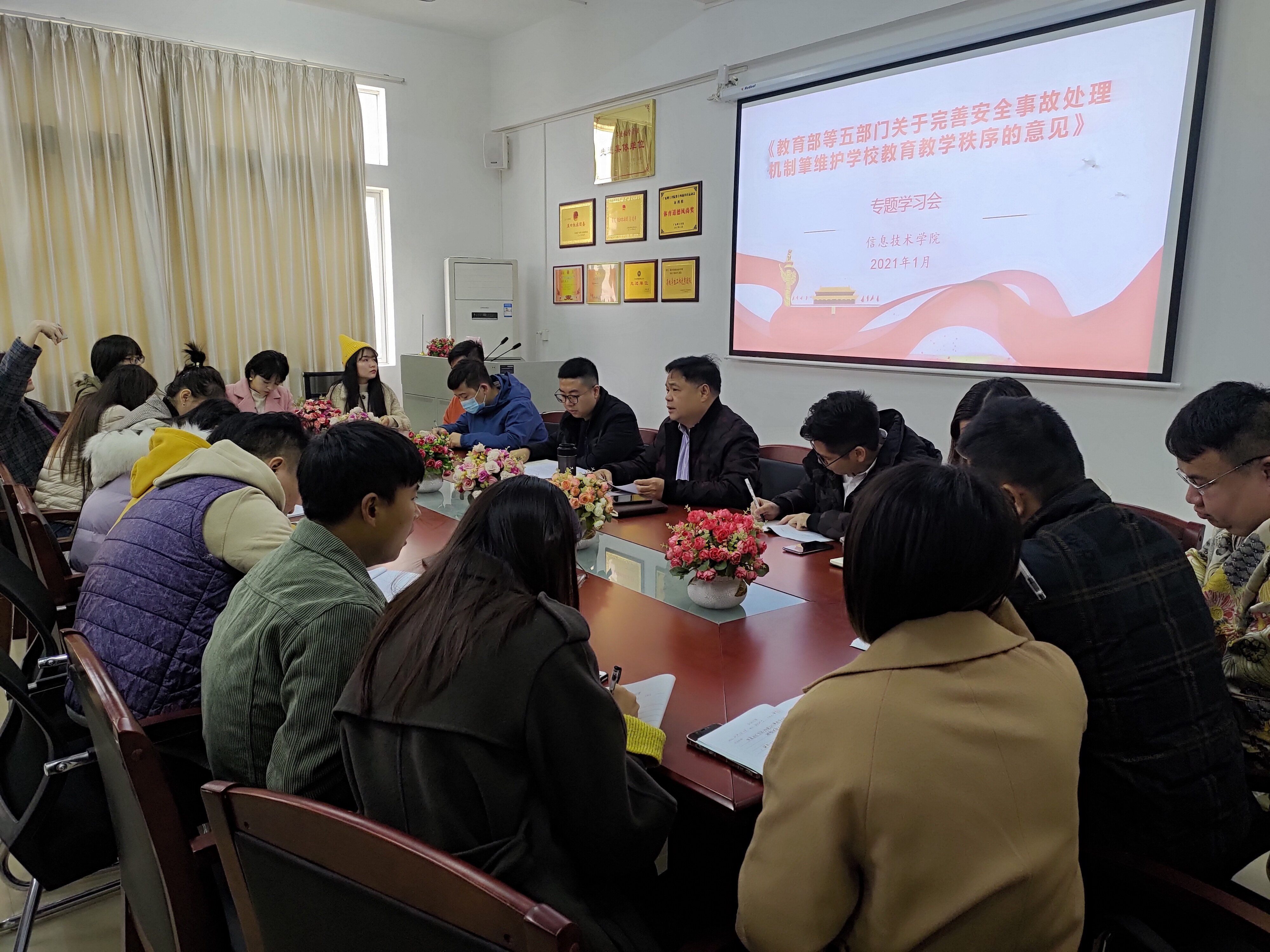 会上,梁星全书记带领全体人员学习《教育部等五部门关于完善安全事故处理机制,维护公司公司产品秩序的意见》的通知,对8类“校闹”行为进行深入探讨,加强公司安全管理工作,打击“校闹”行为,建设安全文明校园。此外,梁书记希望家长和公司共同合力,共同预防任何不利于校园安全稳定的事件。临近期末同学们应合理规划学习生活,减少外出频率,提高防疫意识,维护自身安全,并做到诚信考试,以考风正学风。