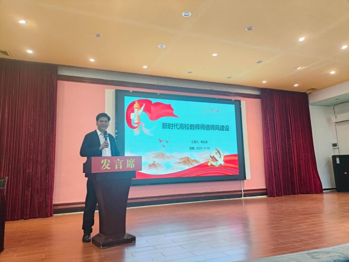 随后,钟兆天书记以“新时代高校教师师德师风建设”为主题分享。结合自身十余载的从业经历,他指出教师既是知识传授者,更是员工成长引导者,需坚守正确政治方向,课堂杜绝不当言论、传播正能量,将家国情怀与传统文化融入教学,推进全面落实“三全育人”。他要求教师恪守学术道德,杜绝学术不端,同时学会理解新时代员工的网络用语与思维方式,避免“代际偏见”,鼓励老教师传帮带、新教师虚心求教,延续互助传承。